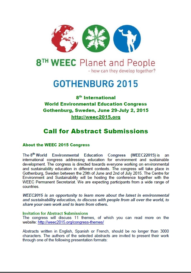 The 8th World Environmental Education Congress (WEEC22015) is an international congress addressing education for environment and sustainable development. The congress is directed towards everyone working on environmental and sustainability education in different contexts. The congress will take place in Gothenburg, Sweden between the 29th of June and 2nd of July 2015. The Centre for Environment and Sustainability will be hosting the conference together with the WEEC Permanent Secretariat. We are expecting participants from a wide range of countries.