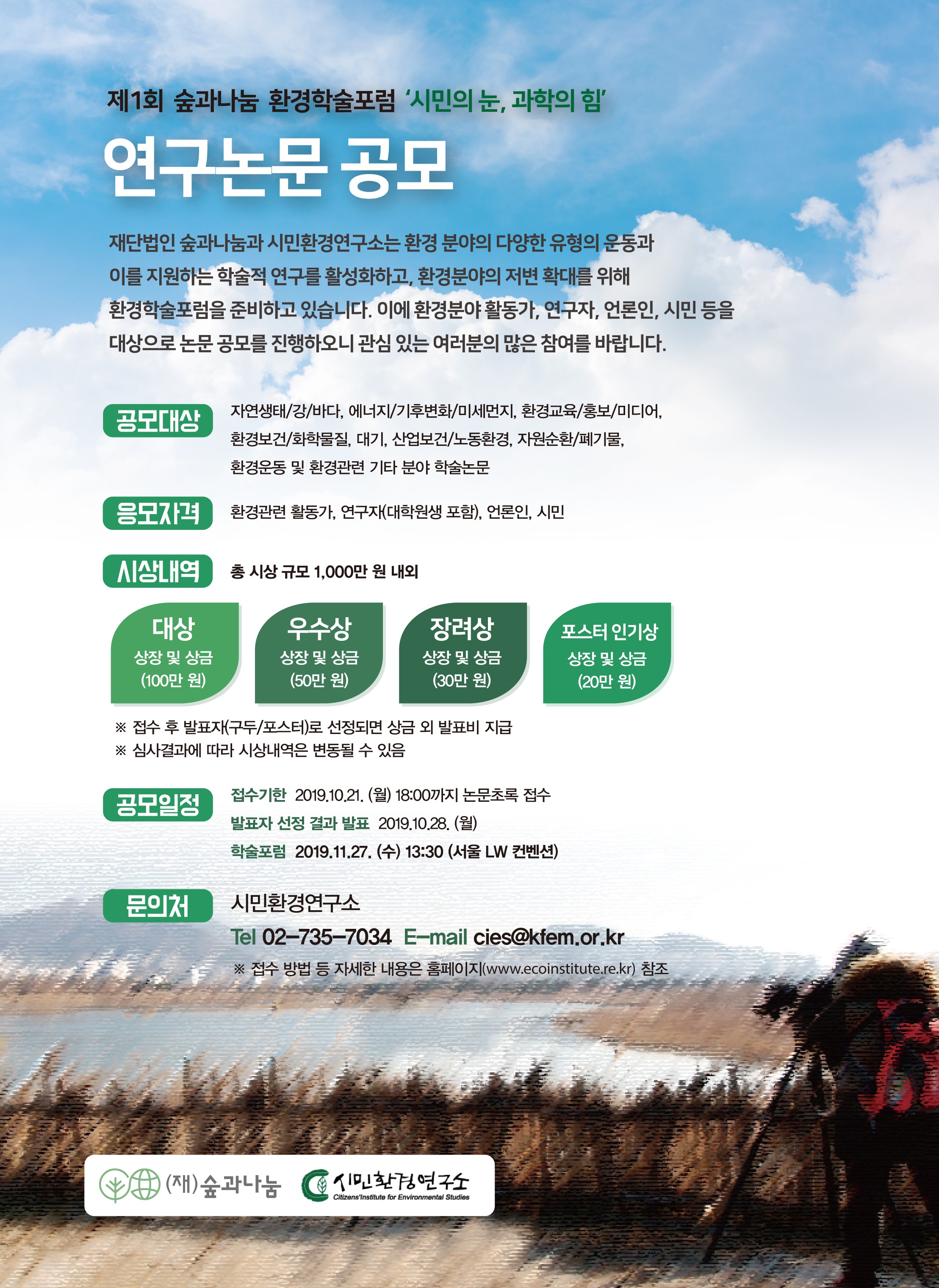 재단법인 숲과나눔과 시민환경연구소는 환경 분야의 다양한 유형의 운동과 이를 지원하는 학술적 연구를 활성화하고, 환경분야의 저변 확대를 위해 환경학술포럼을 준비하고 있습니다.